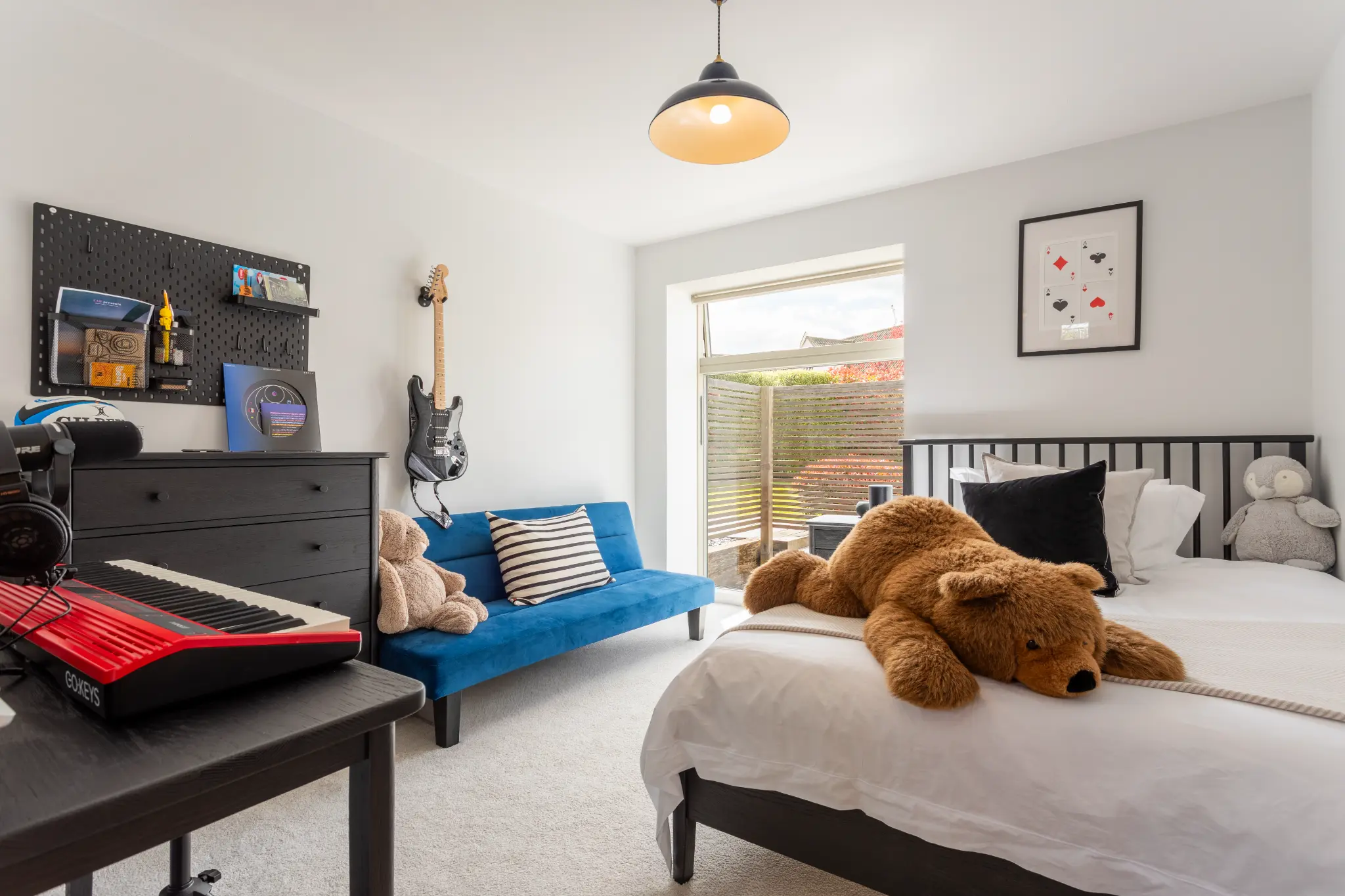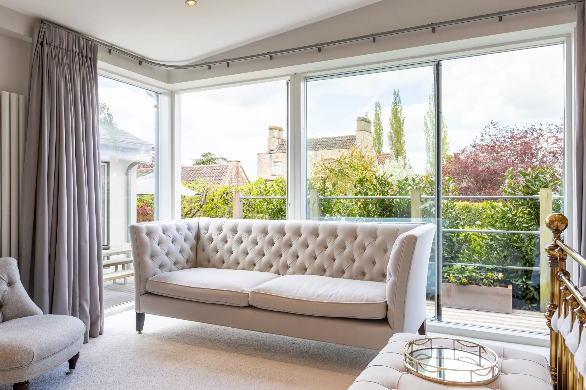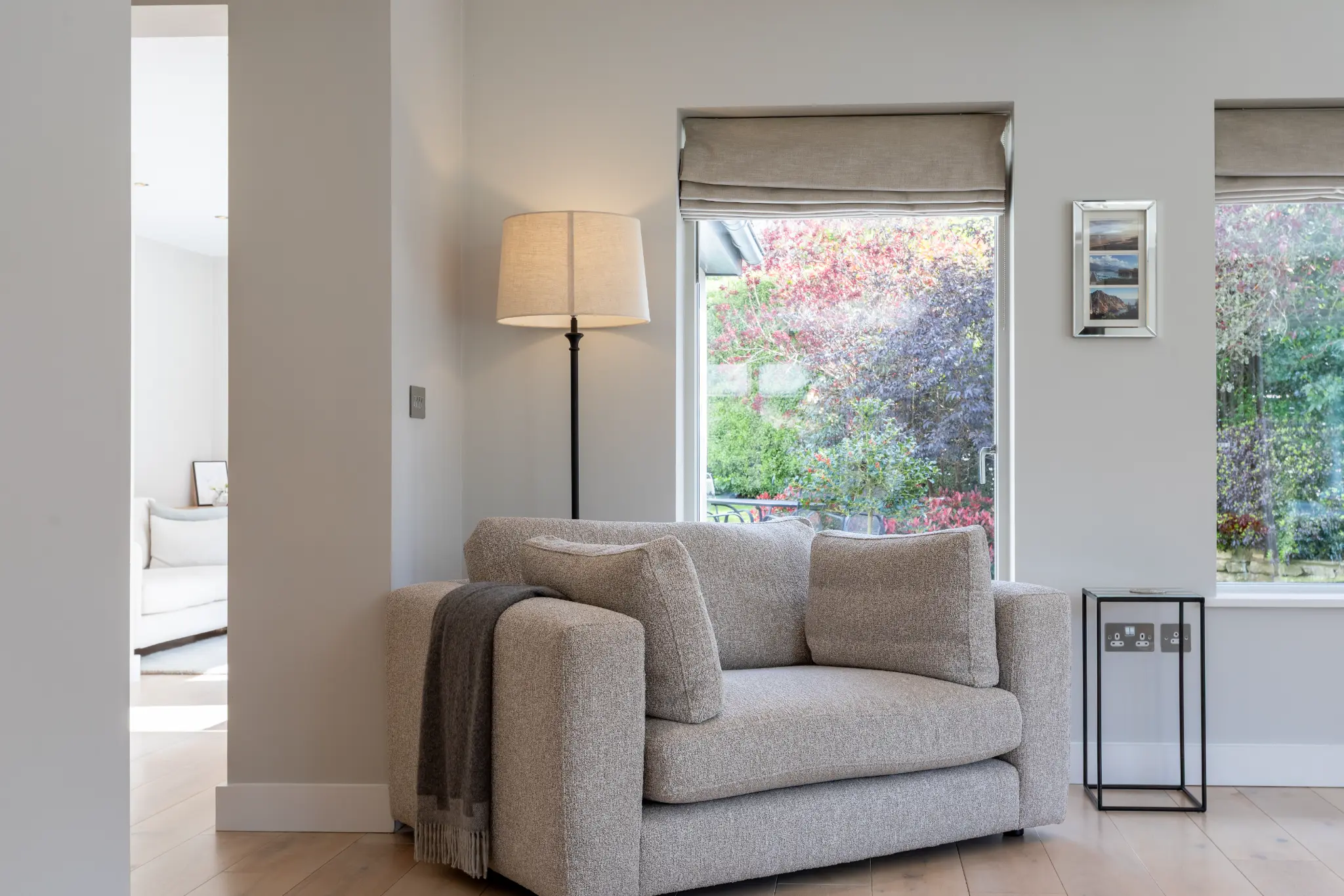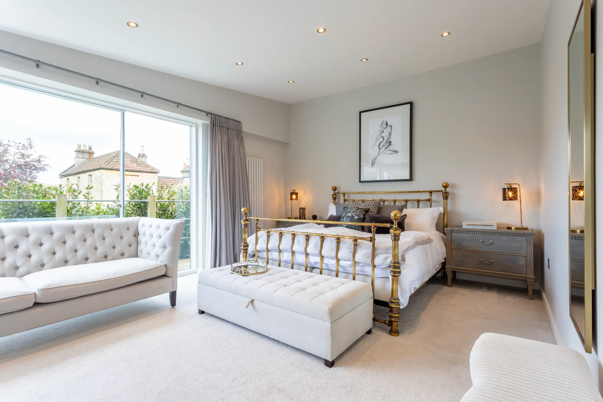 The principal bedroom captures the sense of retreat that buyers at this level are looking for. The composition draws the eye from the carefully dressed bed through to the garden views beyond, creating a sense of space and tranquillity. Professional wide-angle photography makes the room feel generous without distortion.
