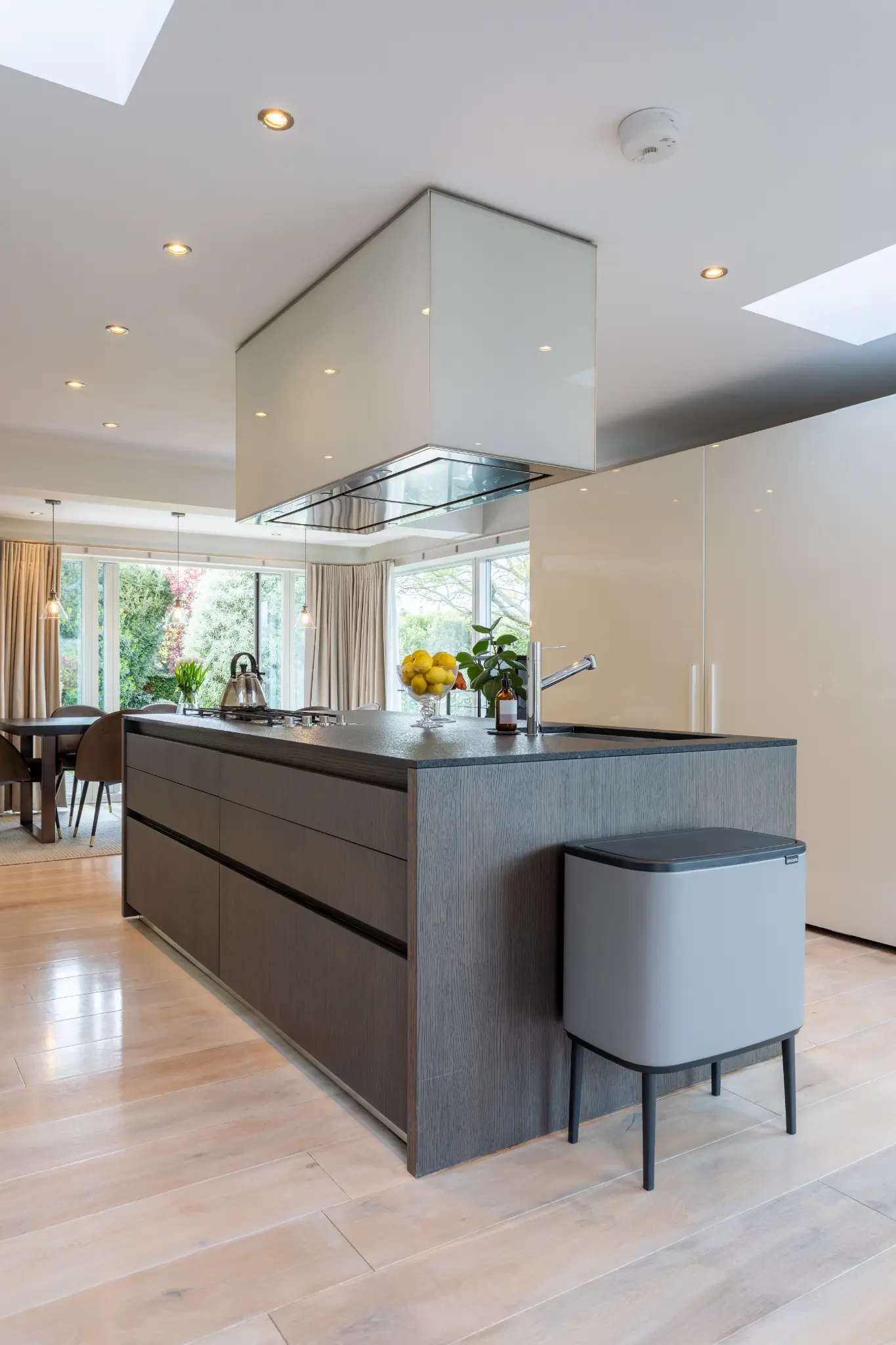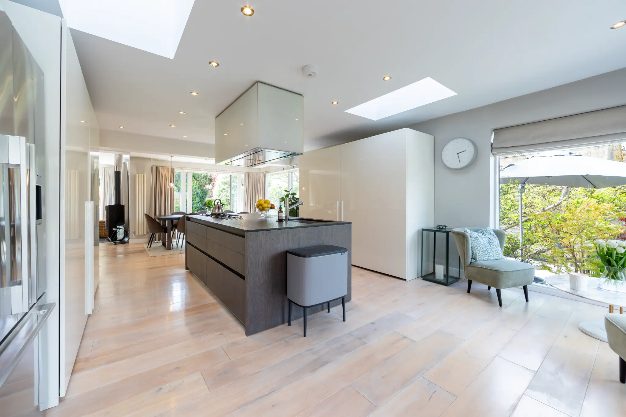 The kitchen is the heart of this home — a large, well-equipped space with a central island, quality cabinetry, and the kind of natural light that makes cooking and entertaining a pleasure. Professional photography captures the full depth of the room, from the foreground worktops through to the window beyond, with every surface properly exposed and the warm tones of the wood and stone rendered faithfully.