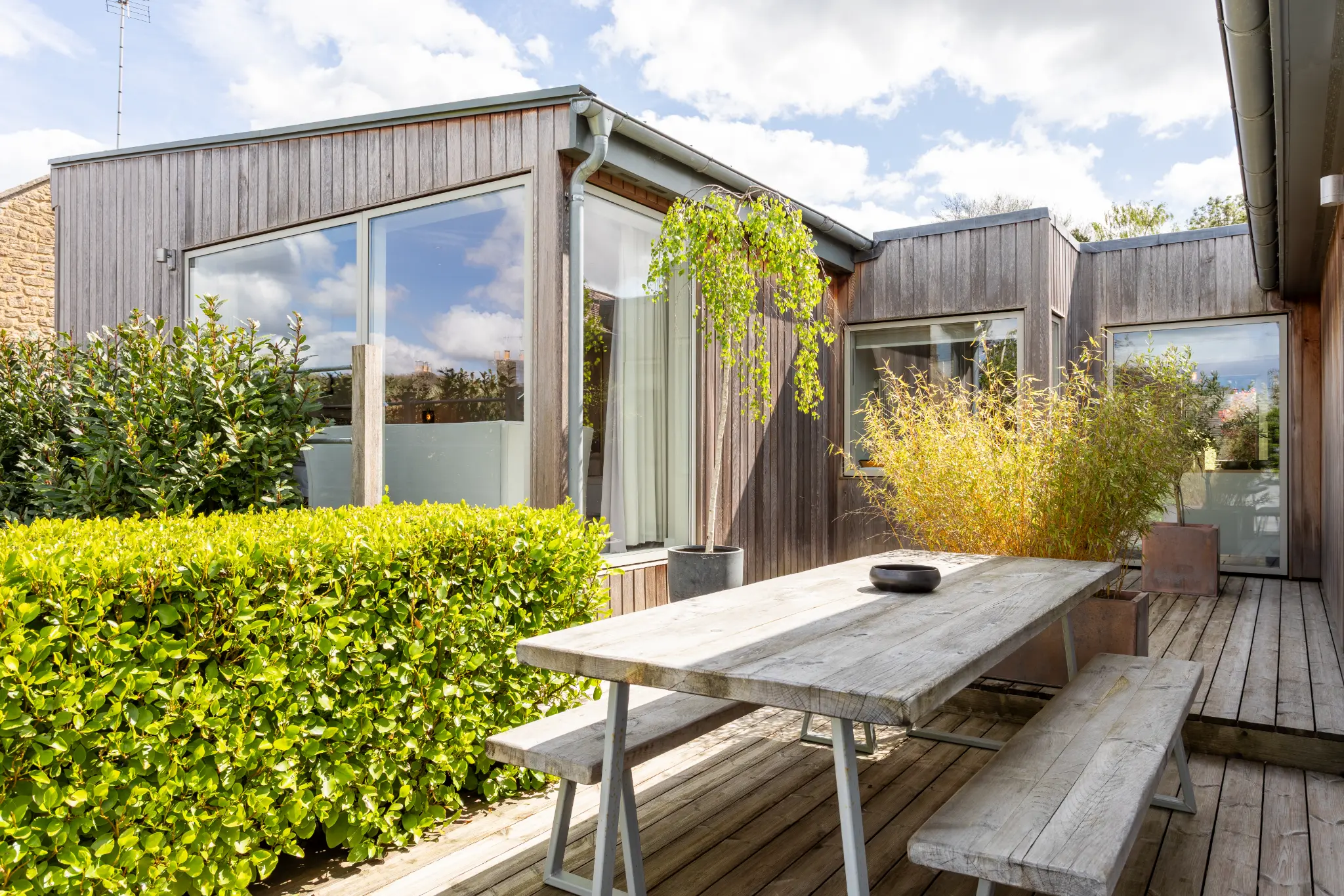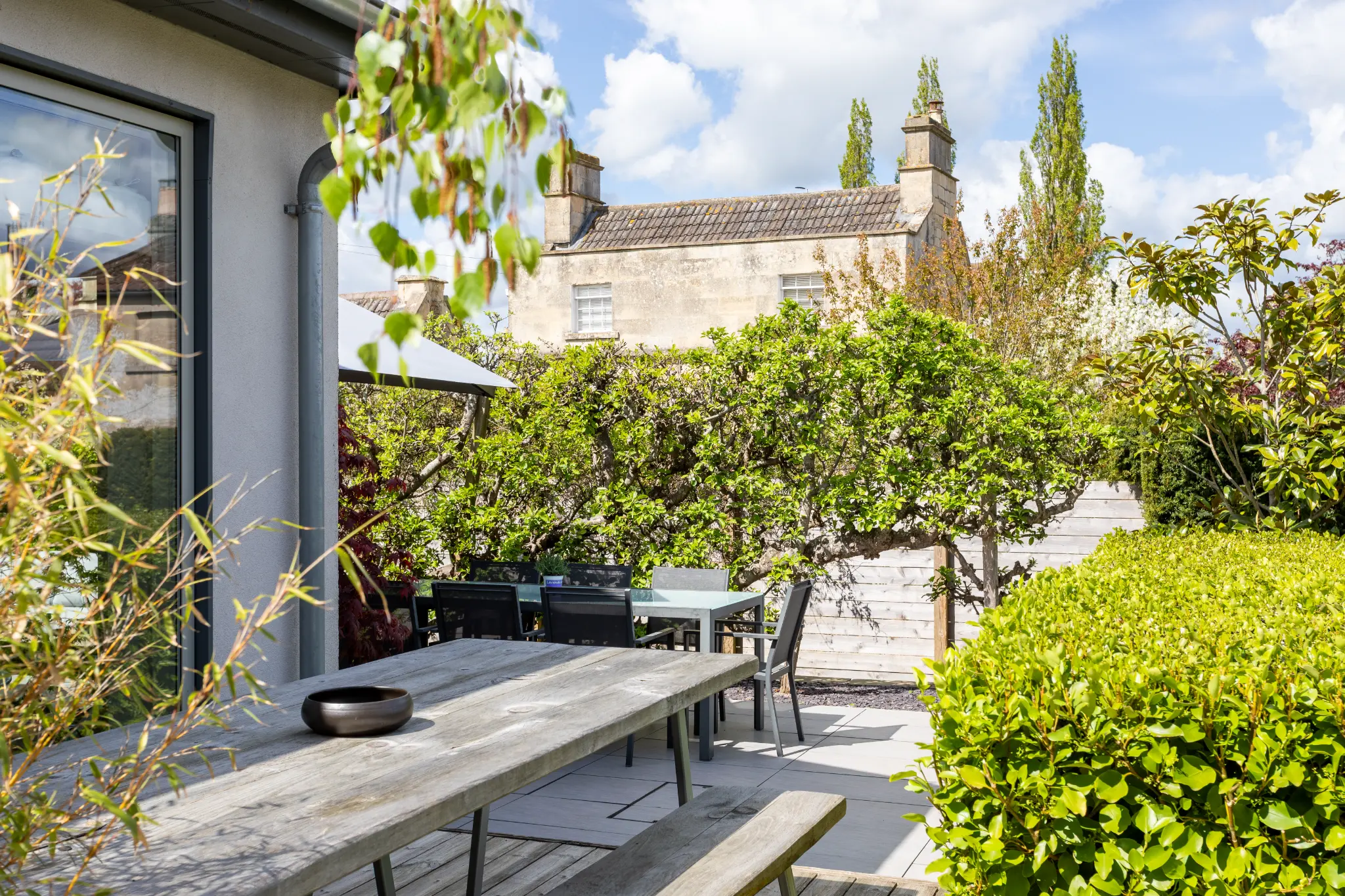 The outdoor entertaining space extends the living area into the garden. This shot shows the potential for al fresco dining and relaxation, with the garden and views as a backdrop.